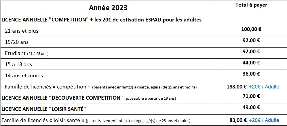 - Votre règlement financier correspondant ( explication pour choisir la licence ) (les 20€ de cotisation ESPAD sont offerts pour les mineurs)